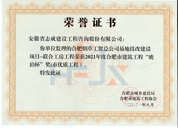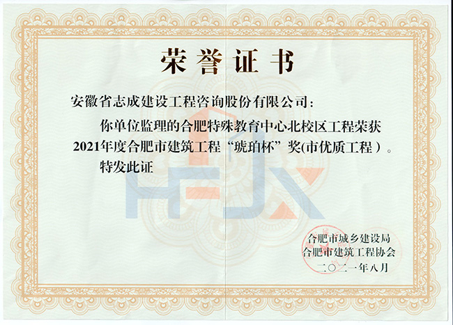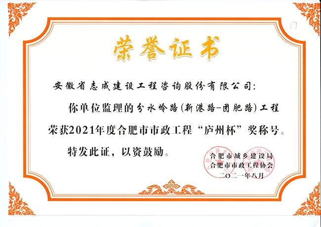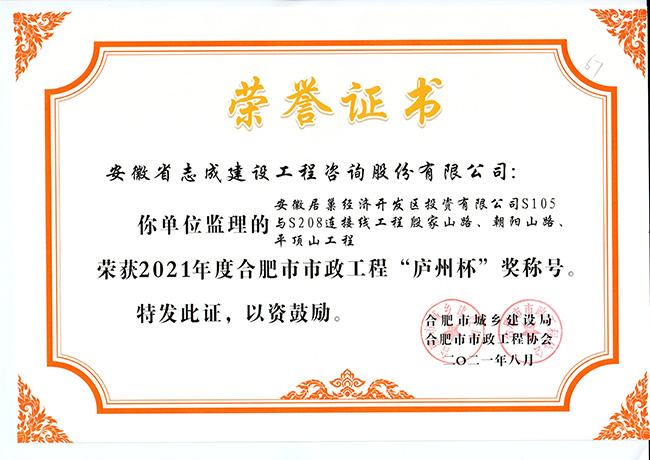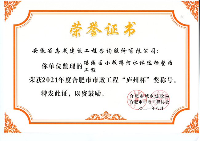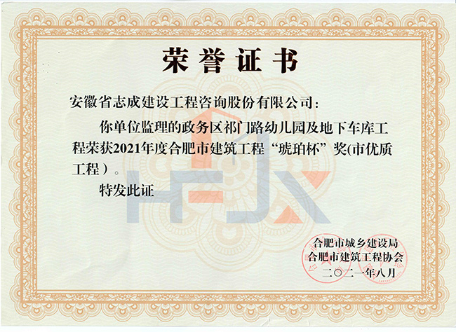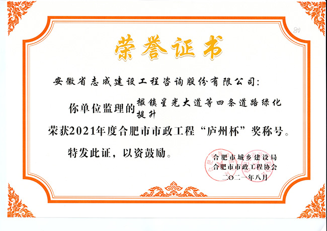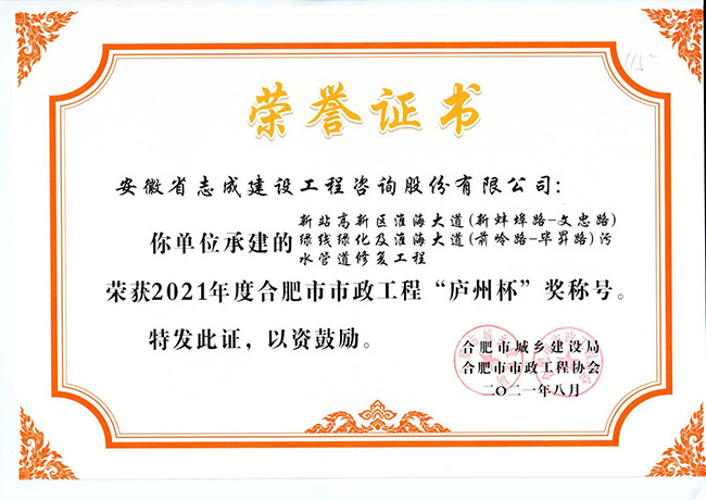 我公司合肥市特殊教育中心北校區(qū)工程、政務(wù)區(qū)祁門路幼兒園及地下車庫(kù)工程、合肥煙草工貿(mào)總公司易地技改建設(shè)項(xiàng)目-聯(lián)合工房工程喜獲2021年度合肥市建筑工程“琥珀杯”獎(jiǎng);.瑤海區(qū)小板橋河水體達(dá)標(biāo)整治理工程、合肥高新區(qū)2019年度第四批綠化工程、分水嶺路(新港路-團(tuán)肥路)工程、新站高新區(qū)淮海大道(新蚌埠路-文忠路)綠線綠化及淮海大道(前嶺路-畢昇路)污水管道修復(fù)工程、撮鎮(zhèn)星光大道等四條道路綠化提升工程、安徽居巢經(jīng)濟(jì)開發(fā)區(qū)投資有限公司S105與S208連接線工程殷家山路、朝陽山路、平頂山工程、肥東縣縣級(jí)道路暢通工程(馬湖至石塘)道路綠化工程喜獲2021年度合肥市市政工程“廬州杯”獎(jiǎng)。